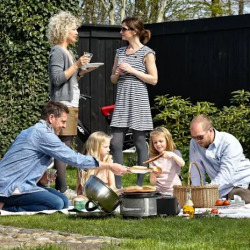 Modellen är superekonomisk och kan grilla i ungefär tre timmar på en enda gasbehållare. Samma storlek som Premier-grillen, vilket innebär att du kan använda alla dina tillbehör till Premier-grillen på den här modellen. Matlagning för upp till 6 personer. Grillplattan på denna modell är försedd med en non stick beläggning och är perfekt för grillning av korv, biffar, kotletter, etc. I innerskålen kan du koka potatis och grönsaker under tiden du grillar på grillplattan – så även om grillen är liten, har den stor kapacitet. Vill du också att kunna röka, långsamt steka, baka och koka, kan du alltid utveckla din Easy to go grill till ett utekök, genom att köpa lock och diverse tillbehör.